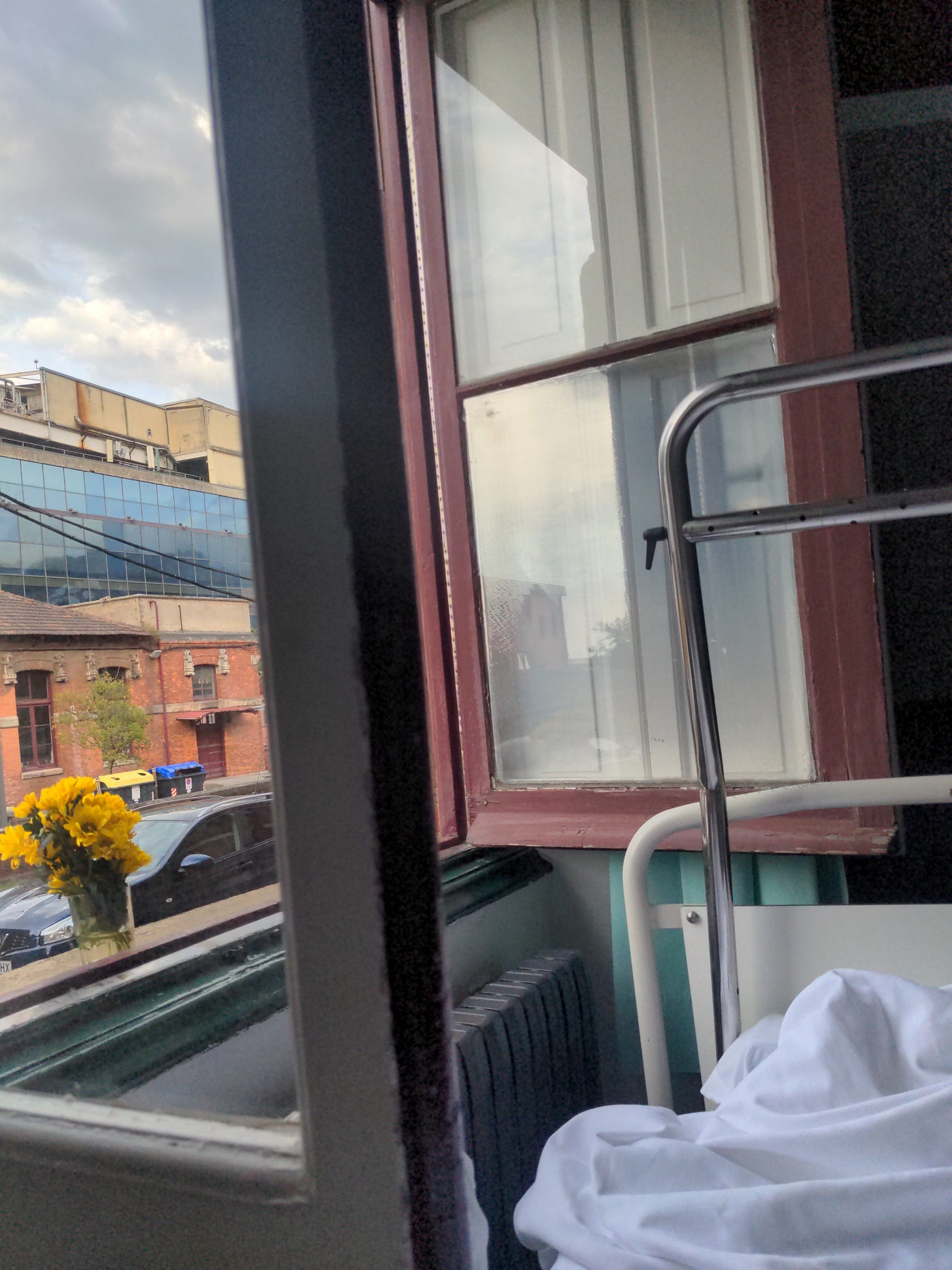 The hospital was built in 1908 and the archaic structure was both beautiful and frightening to me. After 24 hours in intensive care listening to people moaning all night, I was wheeled in the bed through archways, dark corridors, through a medical uniform wing that was unlit and swinging shirts brushed me with ghostly touches when my bed pushed through them. It was getting dark and no one seemed to be around. I was put into a room by myself where I remained for 10 days before being evacuated. Nobody spoke English and I am not a Spanish speaker. My bed was next to a large window with wooden shutters opening to the inside and I looked out at a walkway and a laundry.